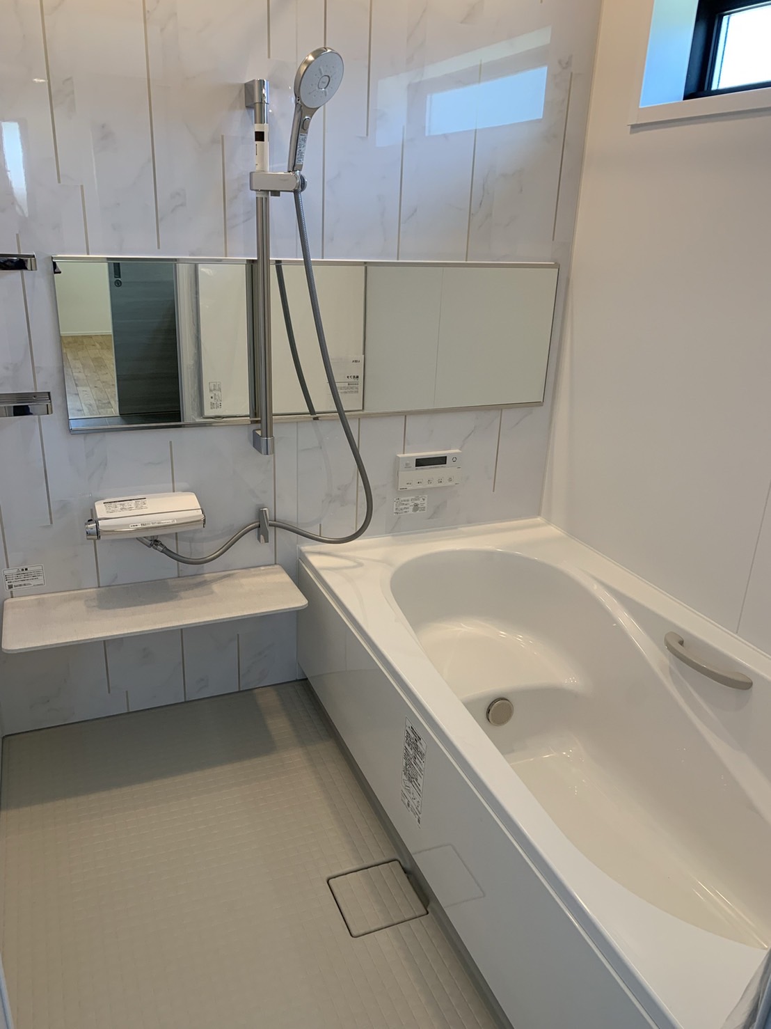 浴槽に腰掛があり半身浴ができます。その分水量が抑えられてエコ仕様です。高齢者の方にも安心してお入りいただける、ユニバーサルデザインです。水栓も使いやすいワイドレバー水栓を採用。